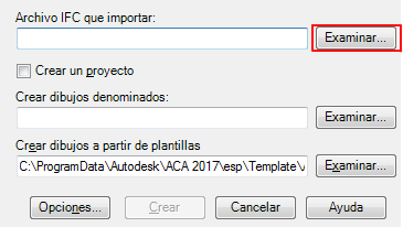 2. En el cuadro de diálogo Importar archivo IFC y crear dibujos, en Archivo IFC que importar, haga clic en Examinar.