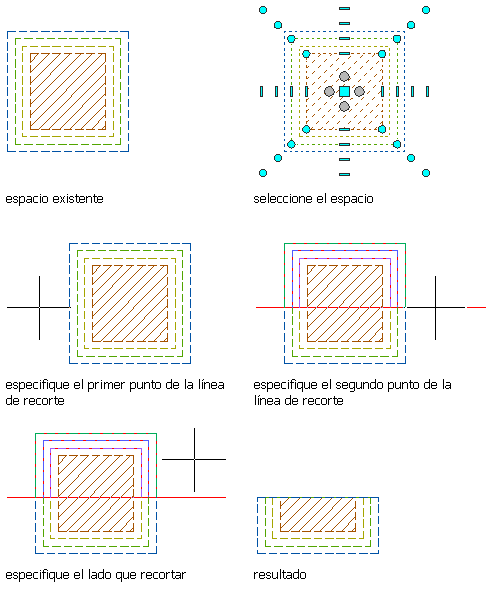 Atención: Si va recortar dividir un espacio con desfases de contornos manuales, verifique que estén activos todos los contornos. Los contornos que no estén activos no se recortarán.