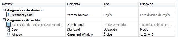 Un relleno define el contenido de una celda de conjunto de puerta y ventana. Una celda de conjunto de puerta y ventana puede contener el panel predefinido o una rejilla anidada, un polígono AEC, una unidad de muro cortina y un estilo de puerta o ventana. Para poderse agregar a una definición de relleno, los estilos de objeto que se utilizan en los rellenos deben existir en el dibujo actual. Los paneles suelen representar cristaleras u otros revestimientos sencillos, como piedra u hormigón.