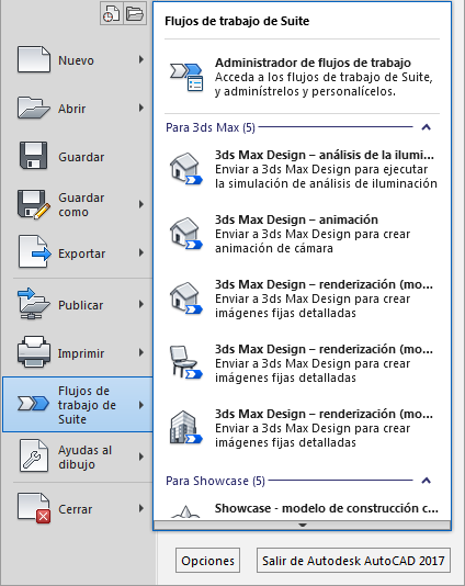 (Solo AutoCAD Suites) Especifica, copia o suprime un flujo de trabajo que prepara los parámetros de dibujo para abrirlos en Autodesk Showcase o Autodesk 3ds Max.