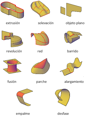 Los modelos de superficie se crean mediante muchas de las mismas herramientas que se utilizan para los modelos sólidos: barrido, solevación, extrusión y revolución. También se pueden crear superficies mediante la fusión, el parcheado, el desfase, el empalme o el alargamiento de otras superficies.