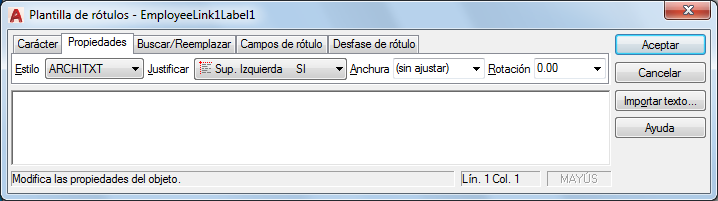 Aplica un estilo de texto al rótulo. El estilo actual se guarda en la variable de sistema TEXTSTYLE. El formato de carácter para el tipo de letra, la altura y los atributos negrita y cursiva se ignora si se aplica un estilo nuevo a una plantilla de rótulo ya existente. Los atributos de apilación, subrayado y color se mantienen en los caracteres en los que se aplica un nuevo estilo. No se aplican estilos con efectos cabeza abajo o hacia la izquierda. Si se aplica un estilo definido con un efecto vertical a un tipo de letra SHX, el texto se muestra en sentido horizontal en el cuadro de diálogo Plantilla de rótulos.