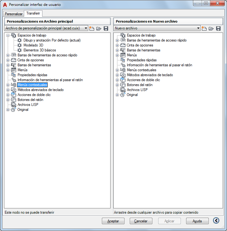 Cuando se escribe IMPORTARIUP en la solicitud de comando, el archivo CUIx principal se muestra en el panel de la derecha (por defecto, acad.cuix para los archivos de AutoCAD o acadlt.cuix para los archivos de AutoCAD LT). Es necesario abrir el archivo CUIx o el archivo de personalización original en el panel izquierdo para transferir los datos. Cuando se escribe EXPORTARIUP en la solicitud de comando, el archivo CUIx principal aparece en el panel izquierdo. Es necesario abrir otro archivo CUIx u otro archivo de personalización original en el panel derecho para transferir los datos.