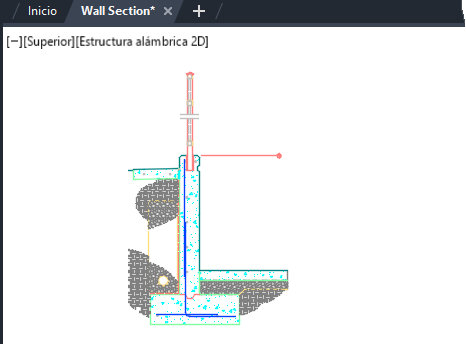 A continuación, se muestra un detalle de un muro de retención en el espacio modelo. Es posible que haya creado la geometría junto con otros detalles en un plano de emplazamiento o que la haya insertado como un bloque. En cualquier caso, desea que se muestre en una ventana gráfica de presentación con una escala específica. Este ejemplo utiliza una escala europea habitual para detalles estándar. Si desea seguir trabajando con uno de sus propios dibujos, en su lugar, elija las escalas que suele utilizar.