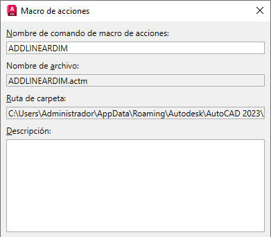 En el cuadro de texto Nombre de comando de macro de acciones del cuadro de diálogo Macro de acciones, introduzca ADDLINEARDIM.