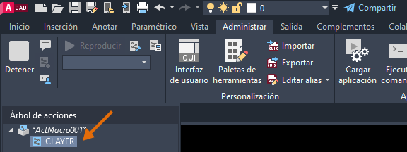 Observe que la variable de sistema CLAYER se graba y se muestra en el Árbol de acciones.