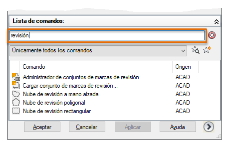 2. En el panel Lista de comandos del editor Personalizar interfaz de usuario (IUP), haga clic en el cuadro de texto Buscar lista de comandos y escriba revisión.