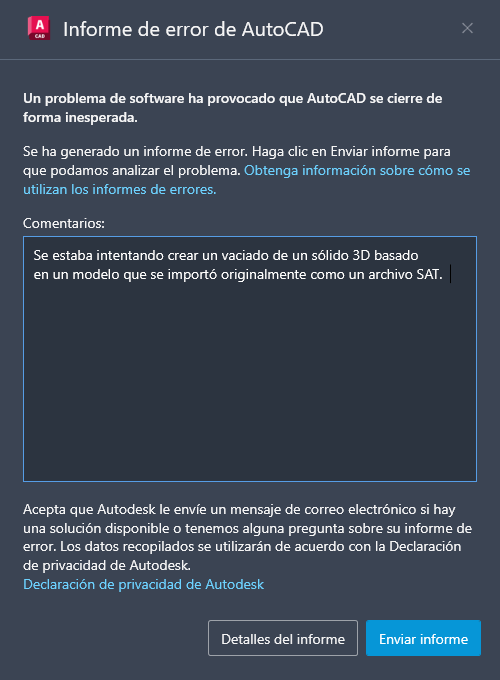 Después de guardar los dibujos abiertos con cambios sin guardar, debe aparecer el cuadro de diálogo Informe de error de AutoCAD. Mediante este cuadro de diálogo, puede enviarnos un informe de error. El informe de error incluye información sobre el estado actual del programa y la estación de trabajo, y puede incluir detalles opcionales como, por ejemplo, la acción que se estaba realizando en el momento de producirse el error. Los informes de error se utilizan para mejorar la estabilidad del producto.