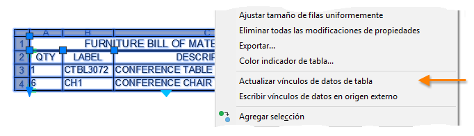- Seleccione la tabla que contiene los datos extraídos, haga clic con el botón derecho y elija Actualizar vínculos de datos de tabla.