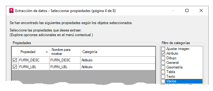 - En Filtro de categorías, desactive todas las opciones, excepto Atributo y, a continuación, asegúrese de que las propiedades seleccionadas coincidan con los valores de atributo que desea extraer.