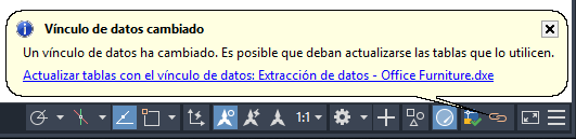 Consejo: Si al menos una tabla de un dibujo contiene datos extraídos, el icono Vínculos de datos se muestra en la bandeja del sistema de la ventana de la aplicación de AutoCAD. Mientras se muestra el icono, haga clic con el botón derecho en él para administrar y actualizar los vínculos de datos de un dibujo. La variable de sistema DATALINKNOTIFY controla el aspecto y la funcionalidad del icono Vínculos de datos.