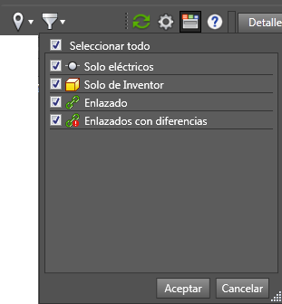 Nota: El botón Filtrar por estado del componente está disponible cuando se ha enlazado un proyecto de AutoCAD Electrical con uno de Inventor.