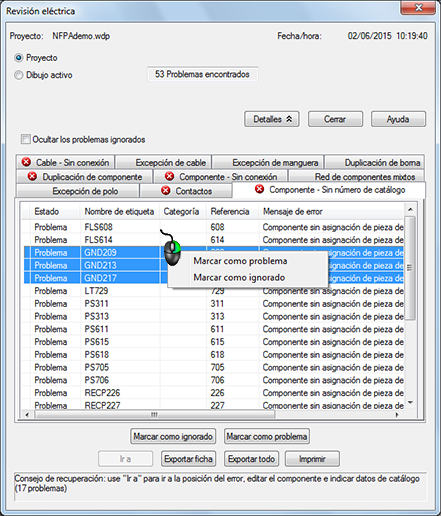 El estado de error se recuerda cada vez que se ejecuta la revisión y en todas las sesiones de AutoCAD Electrical.