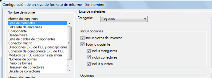 También se ha añadido la opción Incluir piezas de Inventor a la configuración del archivo de formato de informe tanto para los informes de lista de materiales del armario o esquemática.