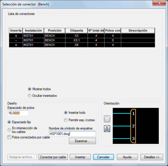 Se abre el cuadro de diálogo Selección de conector, donde puede insertar los conectores y el cable basándose en los datos de Inventor.