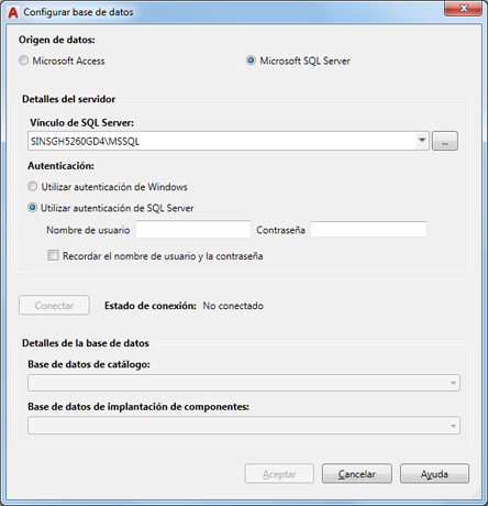 En el modo independiente, puede configurar su SQL Server desde el producto. Utilice el comando AECATALOGCONFIG para abrir el cuadro de diálogo Configurar base de datos, que le permite conectarse y seleccionar las bases de datos de catálogo y de implantación de componentes en una instancia de SQL Server.