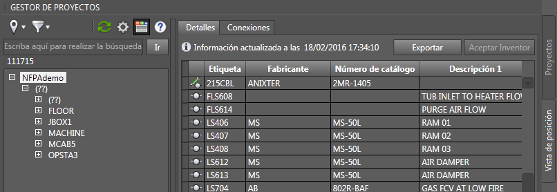 La ficha Vista de posición del Gestor de proyectos incluye ahora un nodo de nivel del proyecto. Seleccione este nodo cuando desee ver o exportar el proyecto completo desde los grupos Detalles y Conexiones.