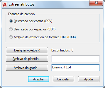 Genera un subconjunto del formato de archivo de intercambio de dibujos de AutoCAD que contiene sólo referencias a bloques, atributos y objetos de final de secuencia. La extracción en formato DXF ™ no precisa plantilla. La extensión del nombre de archivo .dxx permite distinguir el archivo de salida de los archivos DXF normales.