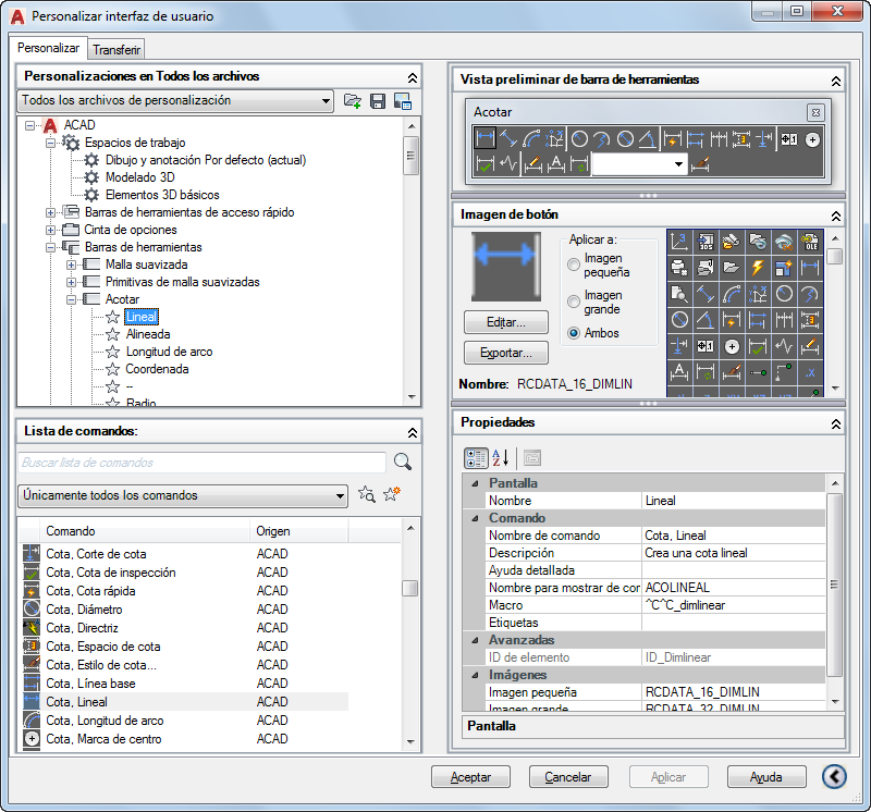 - Imagen grande: precisa el archivo de imágenes grandes que se va a utilizar cuando se añada un comando a una barra de herramientas o un panel de cinta de opciones.