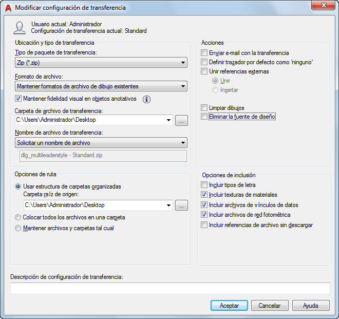 Proporciona opciones para organizar las acciones que se pueden asociar al paquete de transferencia.