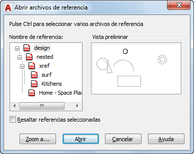 Cierra temporalmente el cuadro de diálogo Abrir archivos de referencia y amplía la vista para mostrar la referencia seleccionada en el área de dibujo. Pulse Intro para volver al cuadro de diálogo.