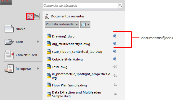 Ver los archivos usados más recientemente en la lista Documentos recientes.