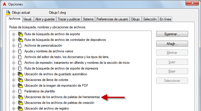 Los archivos de paleta de herramientas contienen las herramientas estándar y aquellas definidas por el usuario. Los archivos se guardan en las ubicaciones especificadas por la opción Ubicaciones de los archivos de paletas de herramientas.