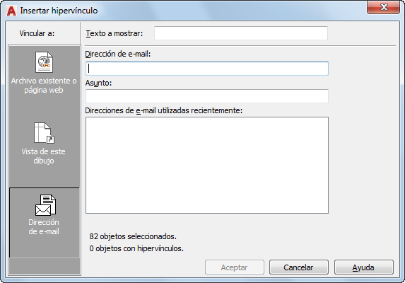 Permite especificar una dirección de correo electrónico a la que asociar el hipervínculo. Cuando se ejecuta el hipervínculo, se crea un nuevo mensaje de correo electrónico en el programa de correo por defecto del sistema.