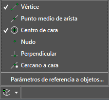 Buscar | Referencia a objetos 2D | Fuerza el cursor al punto más cercano de referencia 2D a medida que se mueve el cursor. Por ejemplo, puntos finales, centros de círculos, puntos medios, etc. |
