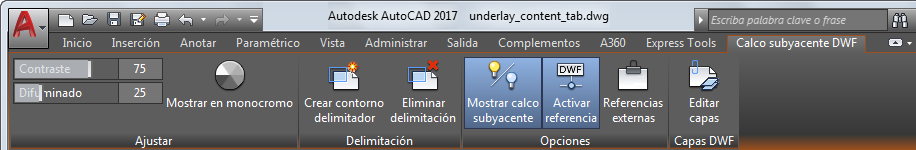 Al seleccionar un calco subyacente DWF en un dibujo, la ficha contextual Calco subyacente DWF aparece en la cinta de opciones.