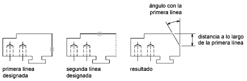 Es posible achaflanar una esquina al especificar la distancia en un lado del chaflán y el ángulo del chaflán.