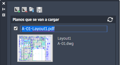 Por defecto, el nombre del archivo PDF es <nombre del dibujo>-<nombre de la presentación>.PDF. Haga clic en el nombre de archivo para editarlo in situ.