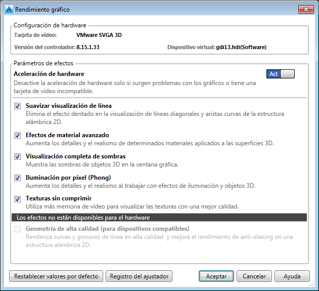 Se puede acceder a la configuración del rendimiento gráfico introduciendo el comando de AutoCAD GRAPHICSCONFIG. De este modo, se abre el cuadro de diálogo Rendimiento gráfico, como se muestra en la figura 15.