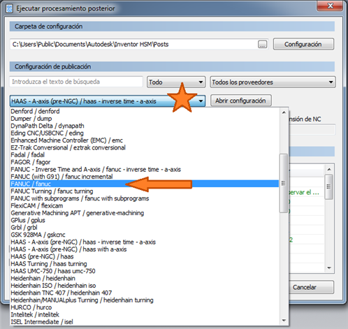 En la página Cuadro de diálogo Ejecutar procesamiento posterior puede controlar distintos elementos. Lo más importante es seleccionar el posprocesador de máquina correcto. Despliegue la lista de la sección Configuración de la publicación del cuadro de diálogo y desplácese hasta la publicación genérica Fanuc. Inventor HSM incluye una amplia selección de posprocesadores para una gran variedad de controles CNC.