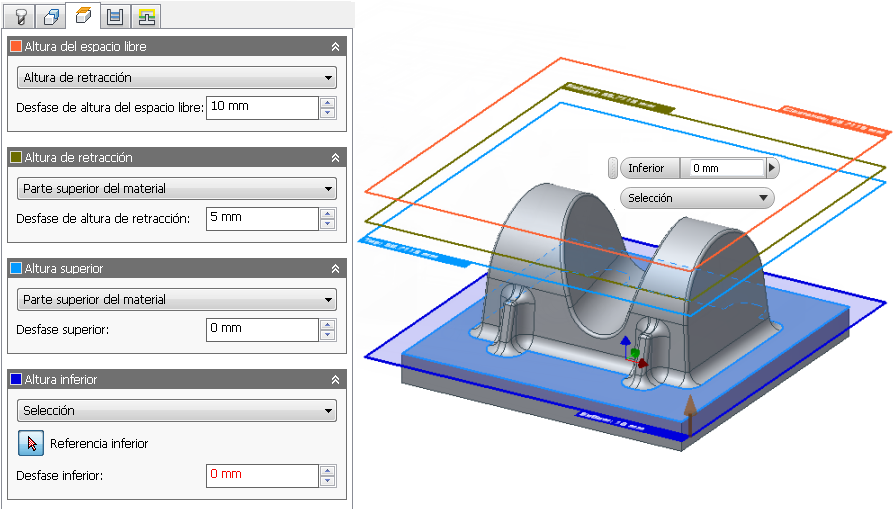 Puede controlar el área de mecanizado por profundidad para la mayoría de las estrategias de mecanizado en la ficha Alturas. El área de mecanizado se define mediante la Altura superior y la Altura inferior. En la ficha Alturas, también puede controlar las retracciones al definir la Altura del espacio libre, Altura de retracción y Altura del avance.. Cada altura está definida por un desfase y un modo que indica la otra altura desde la cual se aplica el desfase. Las alturas absolutas siempre están relacionadas con el origen de la operación que toma por defecto el SCT definido en la configuración.