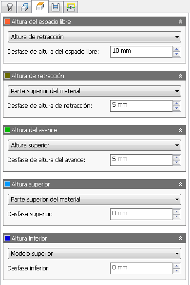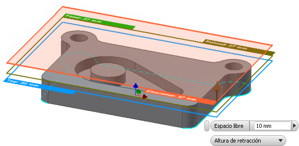 Cada uno de los planos de altura seleccionables aparecen en la ventana gráfica. La Altura del espacio libre es naranja, la Altura de retracción es verde oliva, la Altura del avance es verde, la Altura superior es celeste, y la Altura inferior es de color azul oscuro.