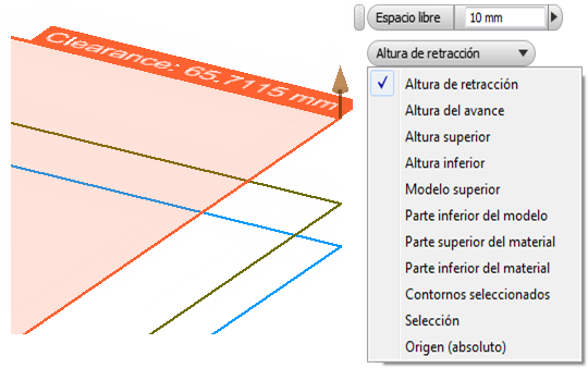 Por ejemplo, si selecciona Altura de retracción en la lista desplegable Altura del espacio libre y el desfase de la altura del espacio libre es de 5 mm, la altura del espacio libre real será 5 mm por encima de la altura de retracción.