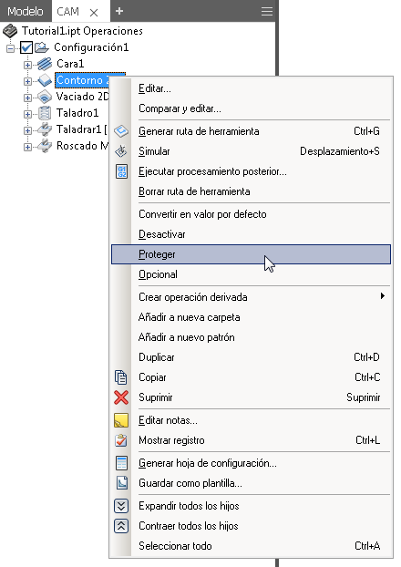 Para proteger una operación, haga clic con el botón derecho del ratón en la operación en el Navegador de CAM y seleccione el menú contextual Proteger. Del mismo modo, puede seleccionar Proteger una vez más para desprotegerla. Una vez desprotegida, la operación se marca automáticamente como no válida y se debe volver a generar.