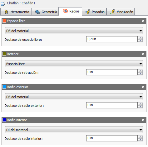 La ficha Radios permite establecer un área de contención radial para el mecanizado. El cuadro de diálogo cambia en función de si el Modo de torneado (parámetro de ficha Herramienta) se establece en Achaflanado exterior o Achaflanado interior. Estos parámetros siguen un código de color para facilitar su identificación.