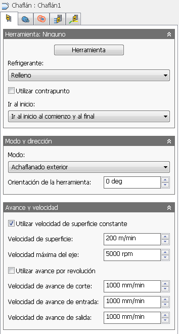 Se muestran de izquierda a derecha: Extensión - Anchura del chaflán - Ángulo