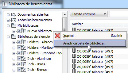 Si desea mantener las bibliotecas de herramientas en una carpeta diferente en su PC o en una ubicación compartida de red, puede añadir otras carpetas de biblioteca haciendo clic con el botón derecho en el árbol de la biblioteca y seleccionando Añadir carpeta de biblioteca en el menú contextual emergente.