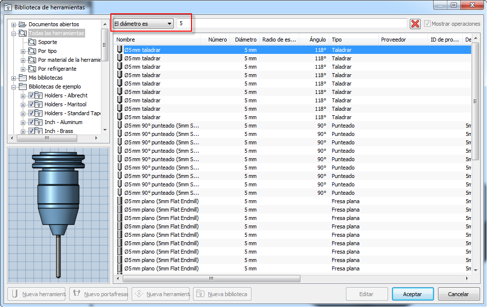 Las otras opciones se pueden utilizar si desea limitar la búsqueda a un determinado campo. Por ejemplo: para buscar todas las herramientas con un diámetro de 5 mm, elija El diámetro es y, a continuación, escriba 5 en el campo de búsqueda.