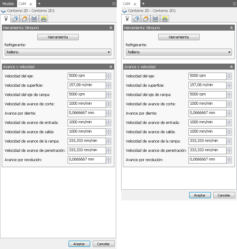 Esta ficha permite seleccionar una herramienta para la operación. También puede editar la herramienta en la Biblioteca de herramientas y definir los avances y las velocidades de la operación.