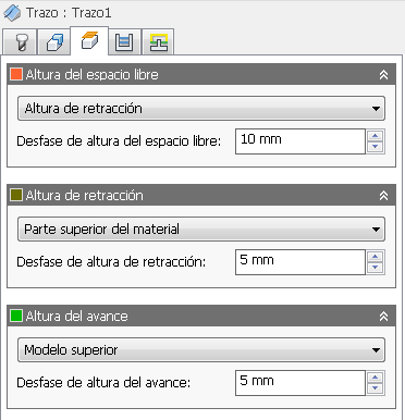 El Desfase de altura de retracción se aplica y es relativo a la selección de Altura de retracción en la lista desplegable anterior.