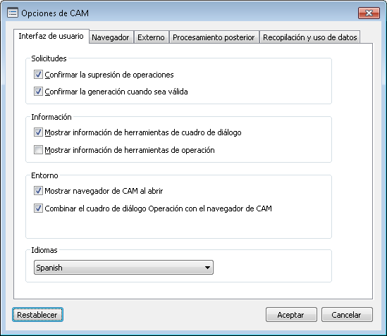 El cuadro de diálogo Opciones de CAM. Puede restablecer los parámetros por defecto en cualquier momento haciendo clic en el botón Restablecer que aparece en cada ficha.