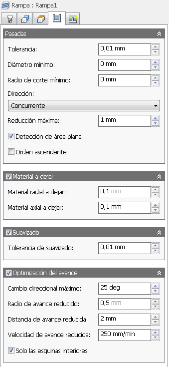 Para las operaciones de acabado, el valor por defecto es 0 mm (0 pulg.), es decir, no se deja material.