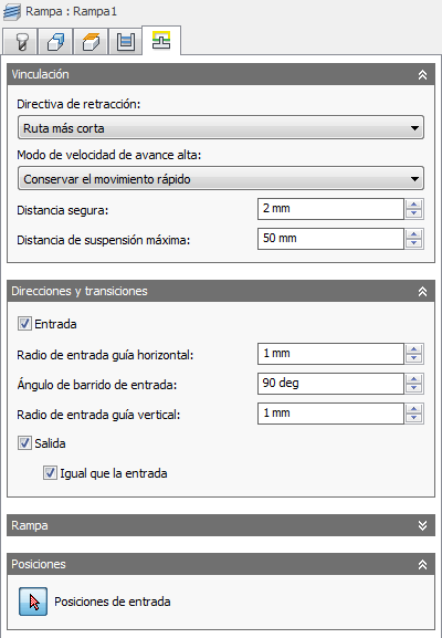 Radio del arco vertical que suaviza el movimiento de entrada a medida que avanza hasta la propia ruta de herramienta.