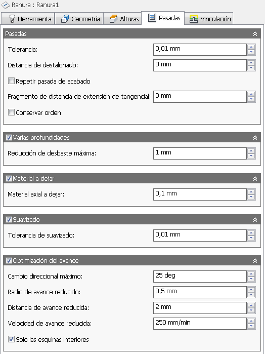Especifica la extensión tangencial de las pasadas.