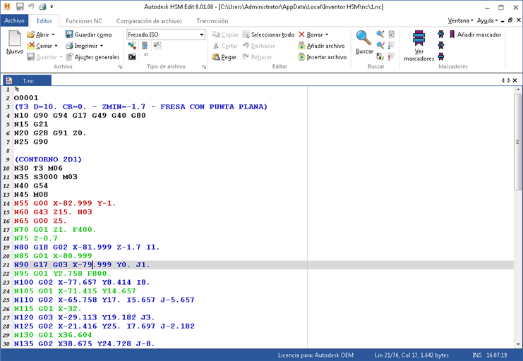 para generar el archivo de programa de CNC. Por defecto, Inventor HSM Edit se abre dónde puede ver y simular el código del programa y transferirlo al control de la máquina.