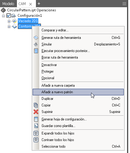Para crear un nuevo patrón de ruta de herramienta, primero debe seleccionar las operaciones que duplicar o de las cuales crear el patrón desde el Navegador de CAM y, a continuación, hacer clic con el botón derecho y seleccionar Añadir a nuevo patrón en el menú contextual emergente.